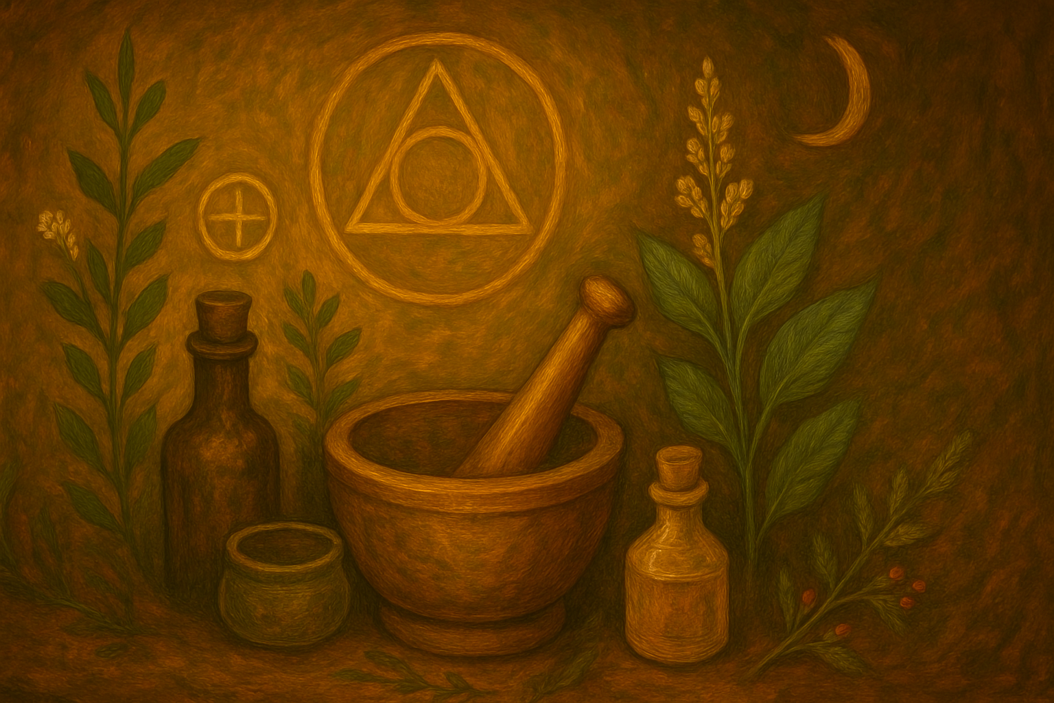 "Tra le erbe e i simboli sacri scorre la fiamma dorata della trasformazione, dove la Natura sussurra il segreto dell'anima."